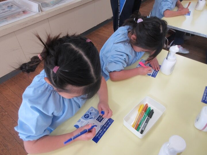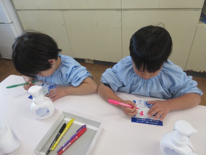みんなでビデオを見てなぜ手洗いをするのか、また手洗いの仕方を学び、その後、世界にひとつだけのオリジナルマイボトルを制作しました。お外から帰ってきたり、おやつやご飯を食べる前には必ず手洗いうがいをし、病気に負けない強い体を作っていきましょうね。