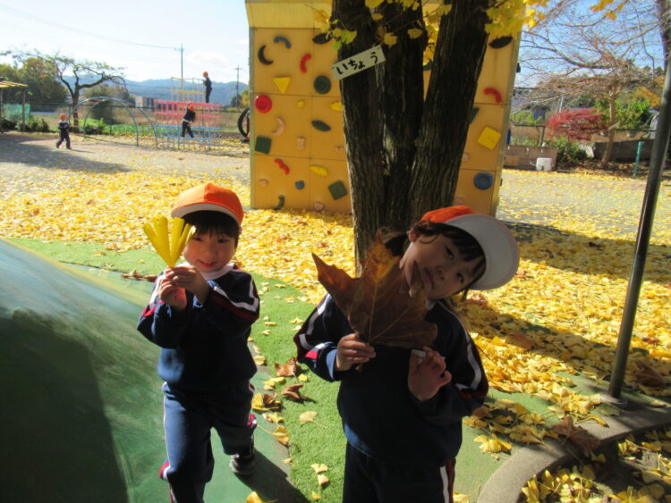 今週は、園庭の木々から落ち葉がたくさん落ち、銀杏の木の下は黄色の絨毯のようでした。
