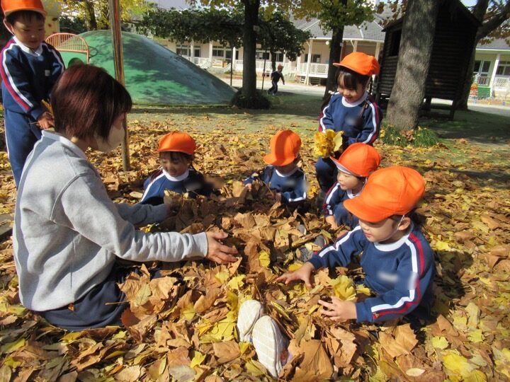 みんな、拾って束にしたり、穴をあけてお面を作ったり、落ち葉のコタツを作って入ってみたり…。それぞれに落ち葉を使って楽しんでいるようでした😊