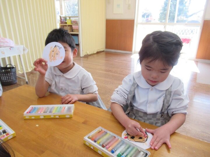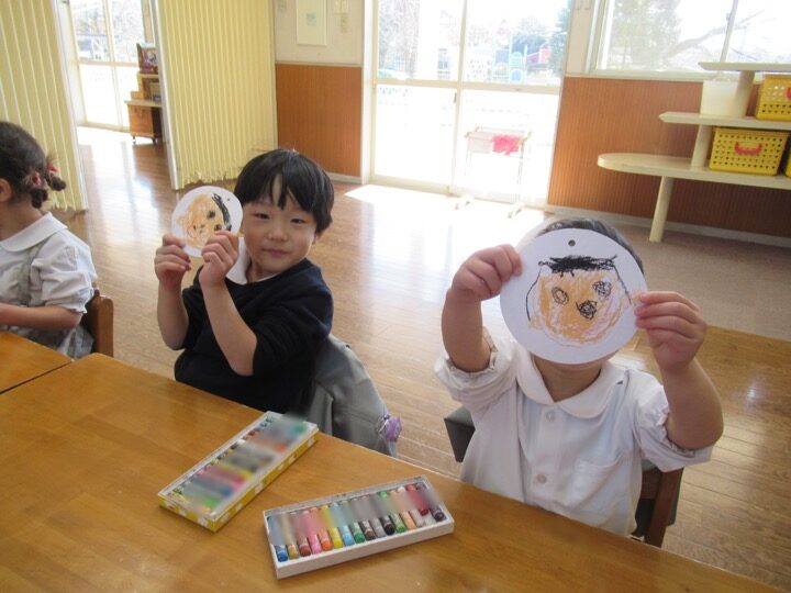 自分の顔を描いてもらい、日めくりカレンダーのようにして、日替わりでお当番さんになってもらい、用具を配ってもらったり、机を拭いてもらったりしています。