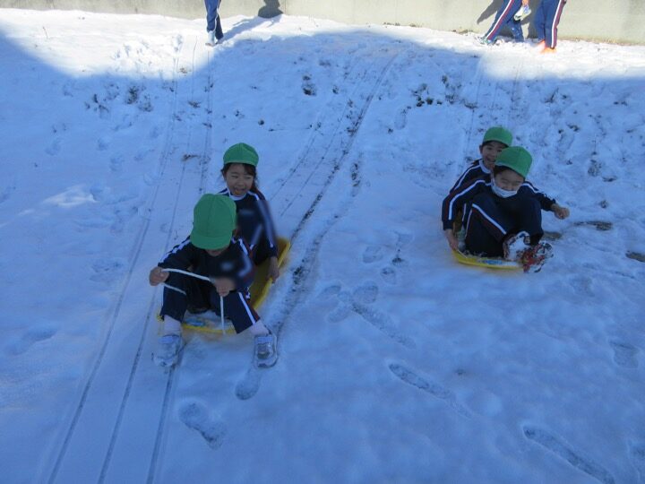 先週末に降った雪が幼稚園でもたくさん積もりました。みんなで雪の感触を楽しみながら走り回ったり、ソリ滑りをして遊びました。